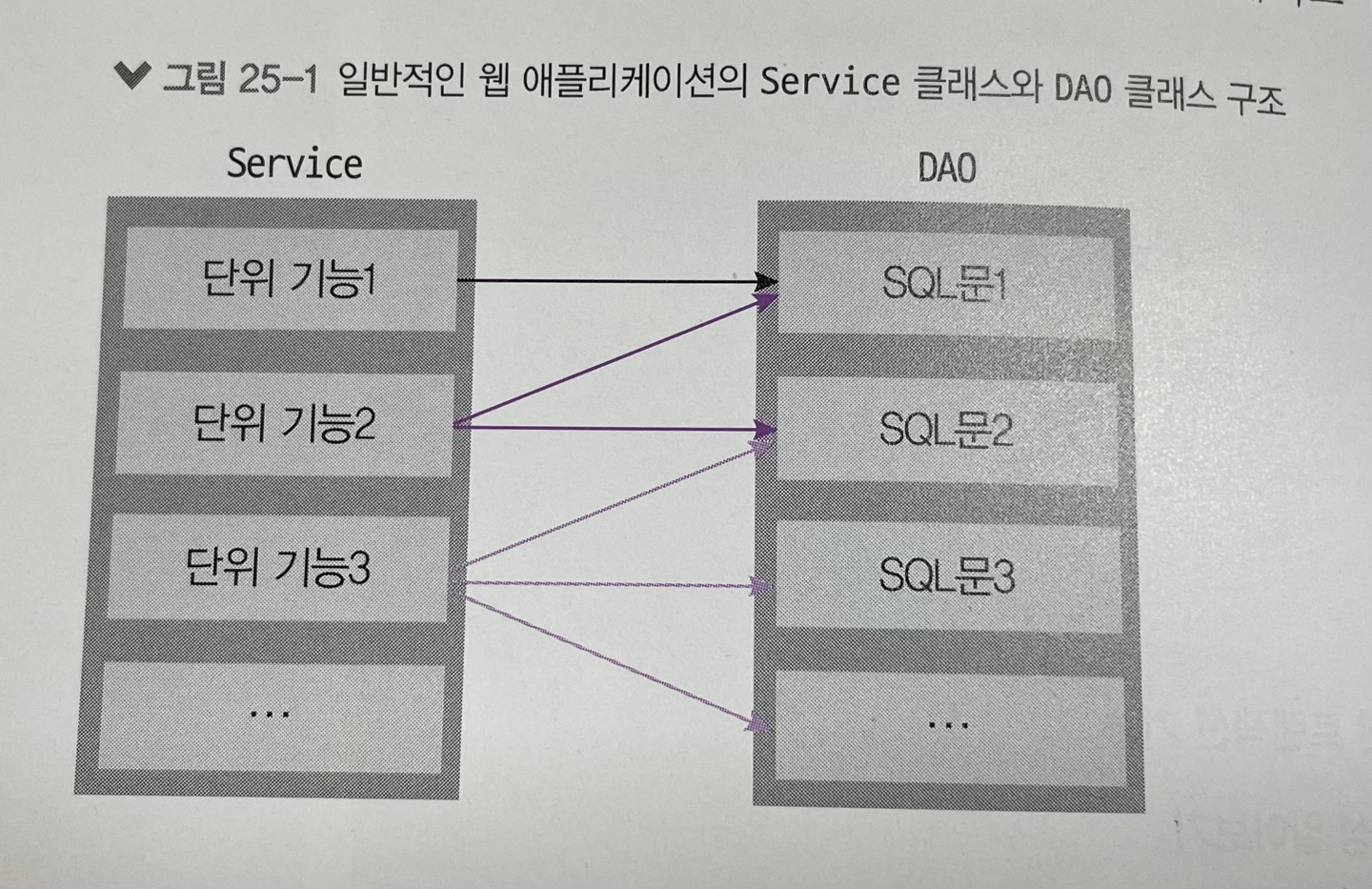 * Service 클래스의 각 메서드가 애플리케이션의 단위 기능을 수행한다. 단위 기능1은 DAO 클래스의 SQL문 하나로 기능을 수행하는 반면에 단위 기능2나 단위 기능3은 여러 개의 SQL문을 묶어서 작업을 처리한다. 그런데 묶어서 작업을 처리할 때는 어느 하나의 SQL문이라도 잘못되면 이전에 수행한 모든 작업을 취소해야만 작업의 일관성이 유지된다.