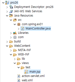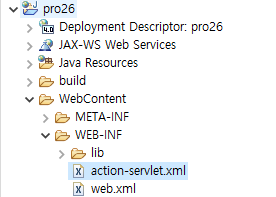 1. 새 프로젝트 pro26을 만들고 스프링 애너테이션 기능을 실습하기 위한 XML 설정 파일인 action-servlet.xml 을 다음과 같이 추가한다.