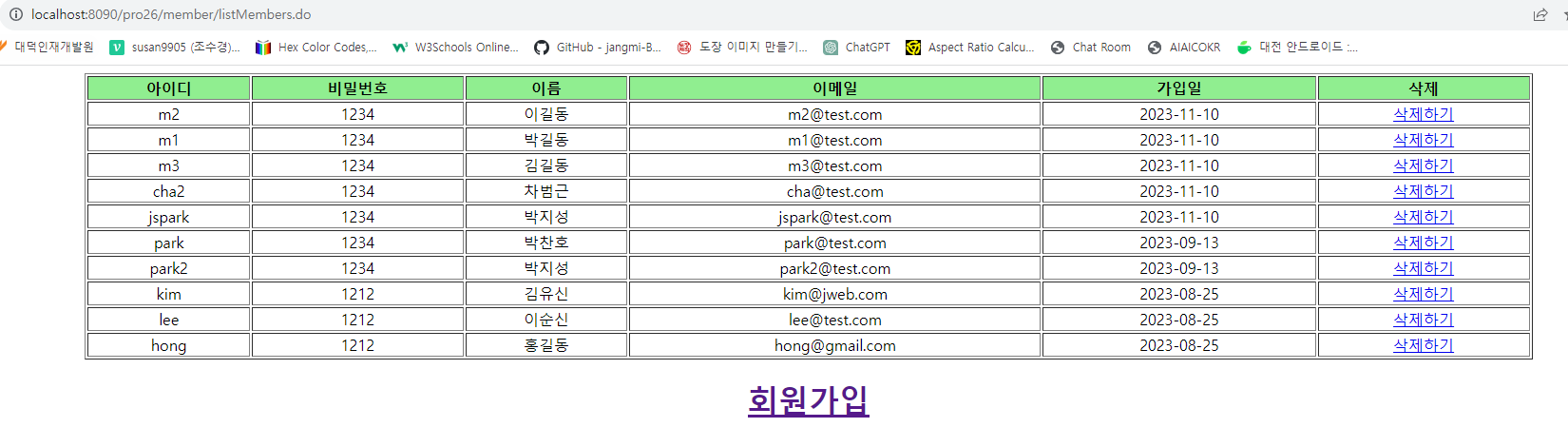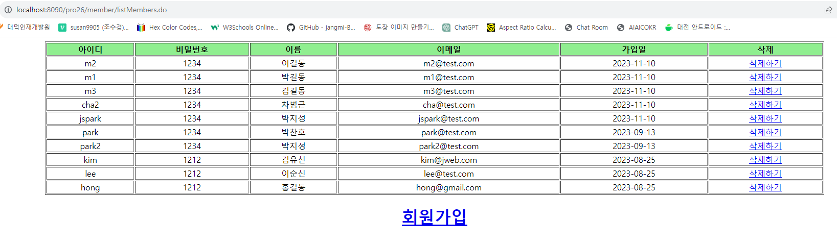 11. 다음의 주소로 요청하면 다음과 같이 회원 목록을 표시한다. 회원가입을 클릭하여 http://localhost:8090/pro26/member/memberForm.do로 요청하면 회원 가입창이 표시된다.