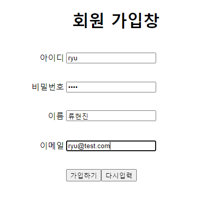 12. 새 회원 '류현진'에 대한 정보를 입력한 후 가입하기를 클릭하여 http://localhost:8090/pro26/member/addMember.do로 요청하면 회원 등록 결과가 표시된다.