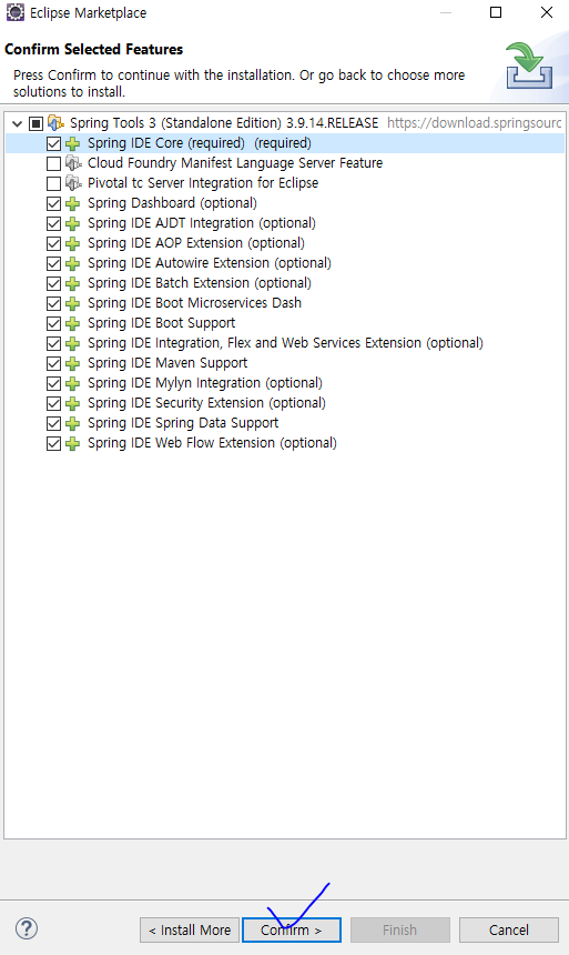 3. (requires) 라고 표시된 항목 외의 항목들은 모두 체크 해제를 한 후 Confirm을 클릭한다.