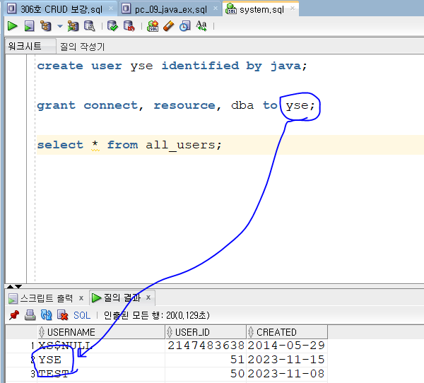 > 명령 프롬프트를 이용하여 sqlplus로 oracle 데이터베이스에 접속 후 yse 계정을 생성
