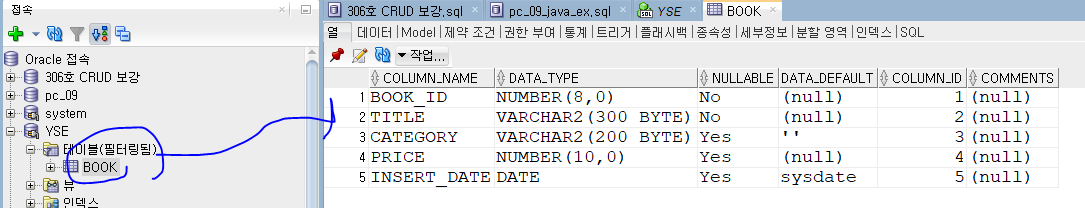 3-2. yse 계정을 이용해 sqldeveloper 접속 후 Book 테이블 생성