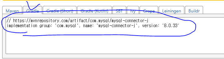 6. 스프링 부트에서 설정하려면 Gradle 탭을 클릭한 후 그루비로 된 정보를 복사해 붙여 넣는다.