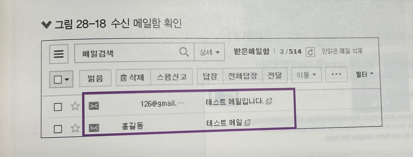 9. 설정한 메일 계정에 접속하여 수신 메일함을 확인해 보면 홍길동으로부터 메일이 온 것을 볼 수 있다.