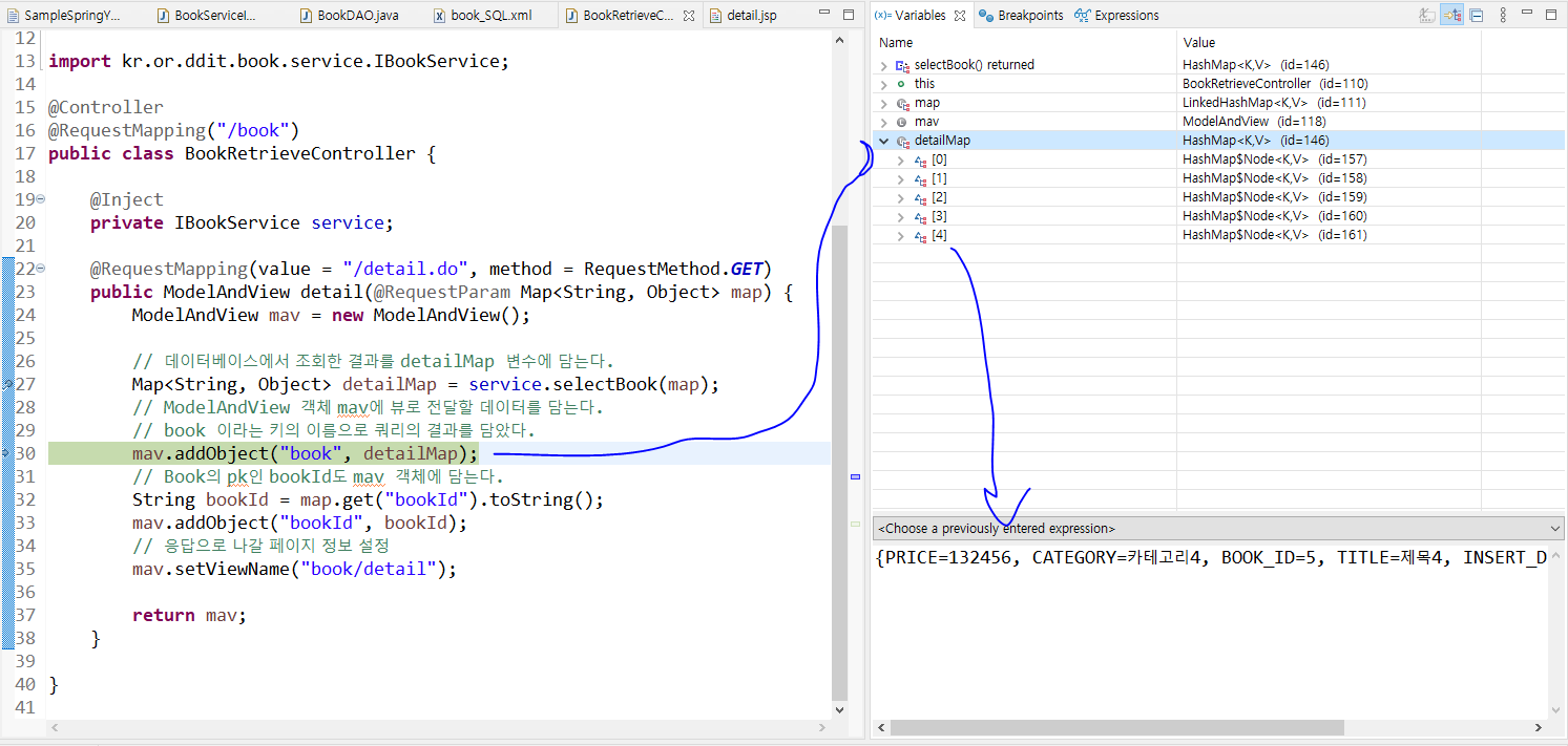 // 데이터베이스에서 조회한 결과를 detailMap 변수에 담는다.