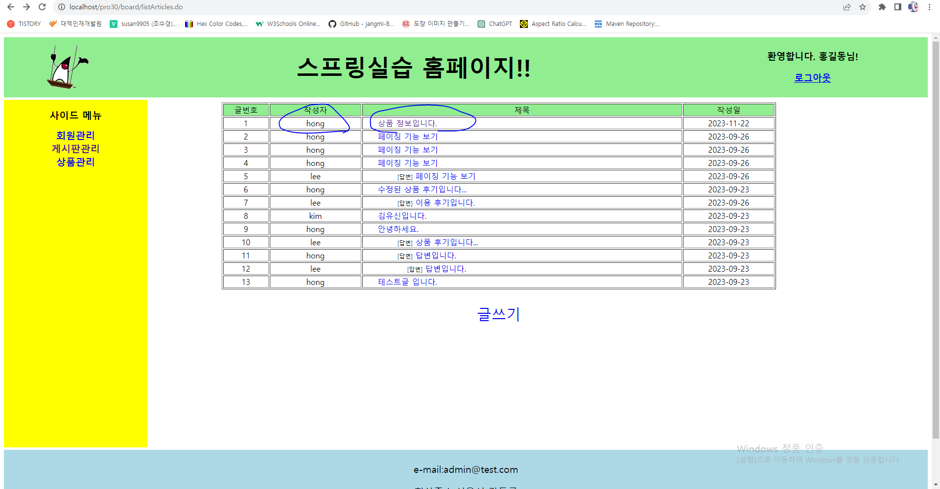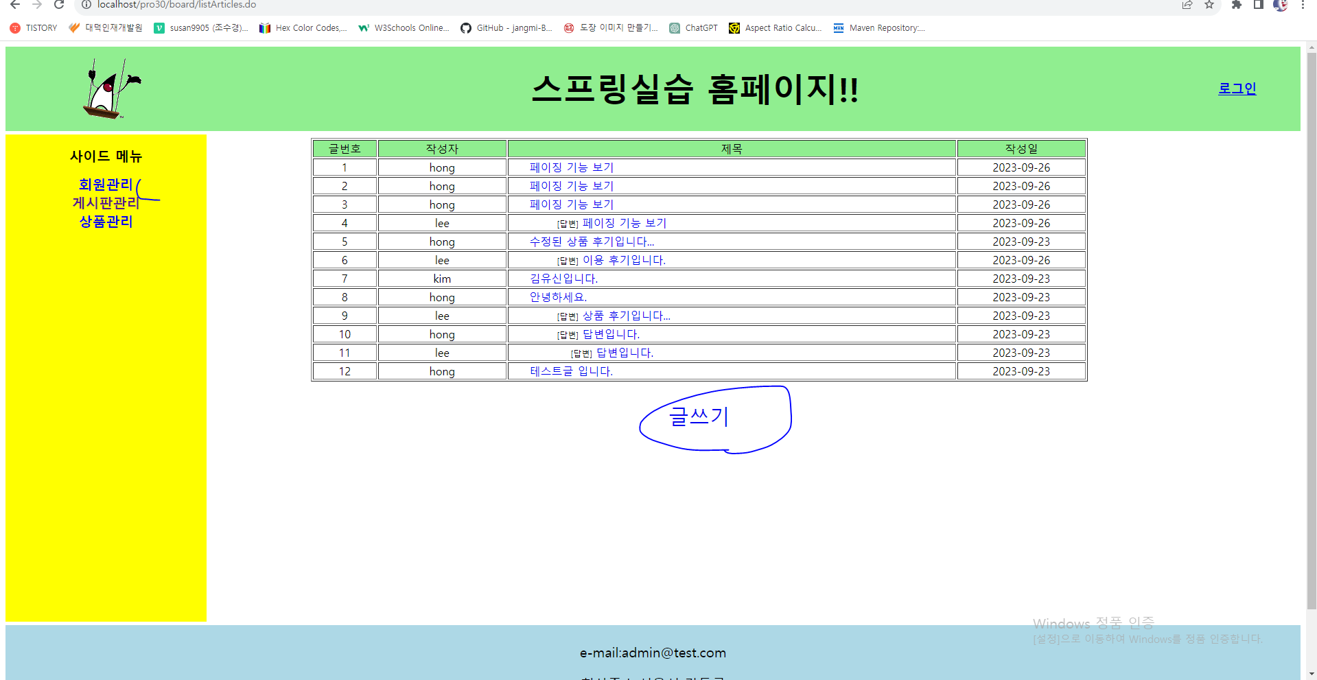 3. 브라우저로 요청하여 글목록창을 나타낸 후 글쓰기를 클릭한다.