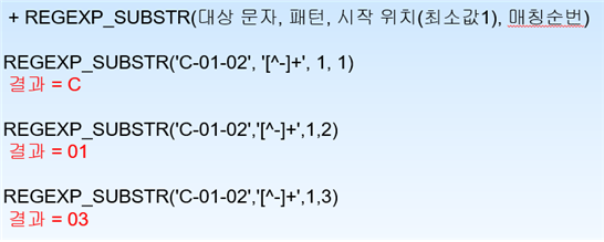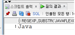SELECT REGEXP_INSTR('JAVA Flex Oracle','[ae]', 1, 1, 0, 'i') RESULT, -- a나 e가 대소문자구분없이(i) 첫번째 오는 위치로 부터 첫번째 오는 위치 => 2