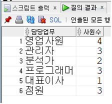 --COUNT(*) 함수를 이용하여 담당업무가 동일한 사원 수를 출력하시오.