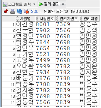 -- SELF JOIN을 사용하여 사원의 이름 및 사원번호를 관리자 번호와 함께 출력하시오.