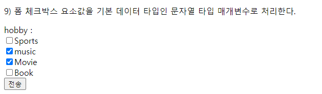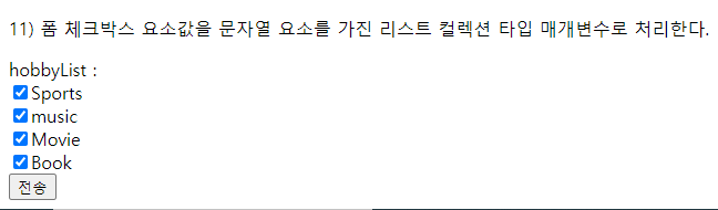 // 11) 폼 체크박스 요소값을 문자열 요소를 가진 리스트 컬렉션 타입 매개변수로 처리한다.