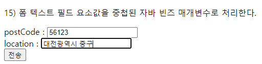 <p>15) 폼 텍스트 필드 요소값을 중첩된 자바 빈즈 매개변수로 처리한다.</p>