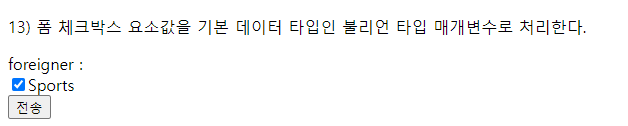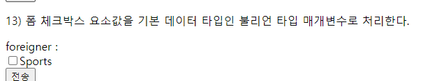 <p>13) 폼 체크박스 요소값을 기본 데이터 타입인 불리언 타입 매개변수로 처리한다.</p>