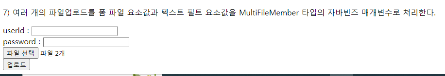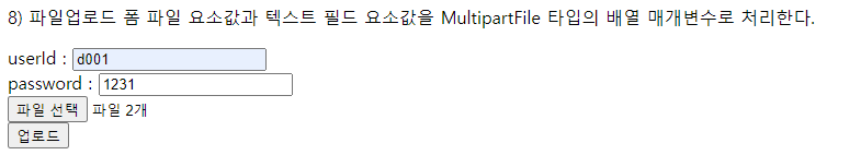 <p>3) 파일 업로드 폼 파일 요소값과 텍스트 필드 요소값을 MultipartFile 매개변수와 자바빈즈 매개변수로 처리한다.</p>