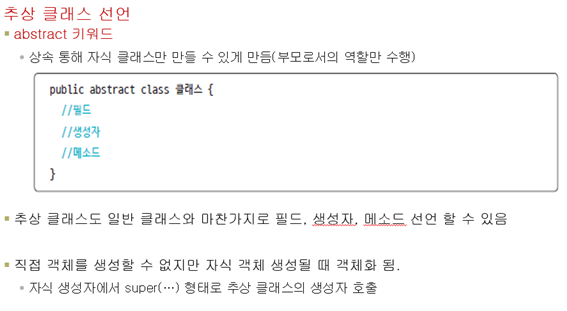 객체가 만들어질 실체 클래스의 공통적 특성을 가진 메서드를 정의하는 것이 추상 클래스. 따라서 추상 메서드를 가지고 있어야 한다. 몸통이 없고 헤드만 있는 메서드. 따라서, 미완성 메서드. 객체로 만들어질 수 없다. new 연산자의 대상이 될 수 없고 상속이 되어진 클래스에서 재정의로 몸통을 달아줘야 한다.