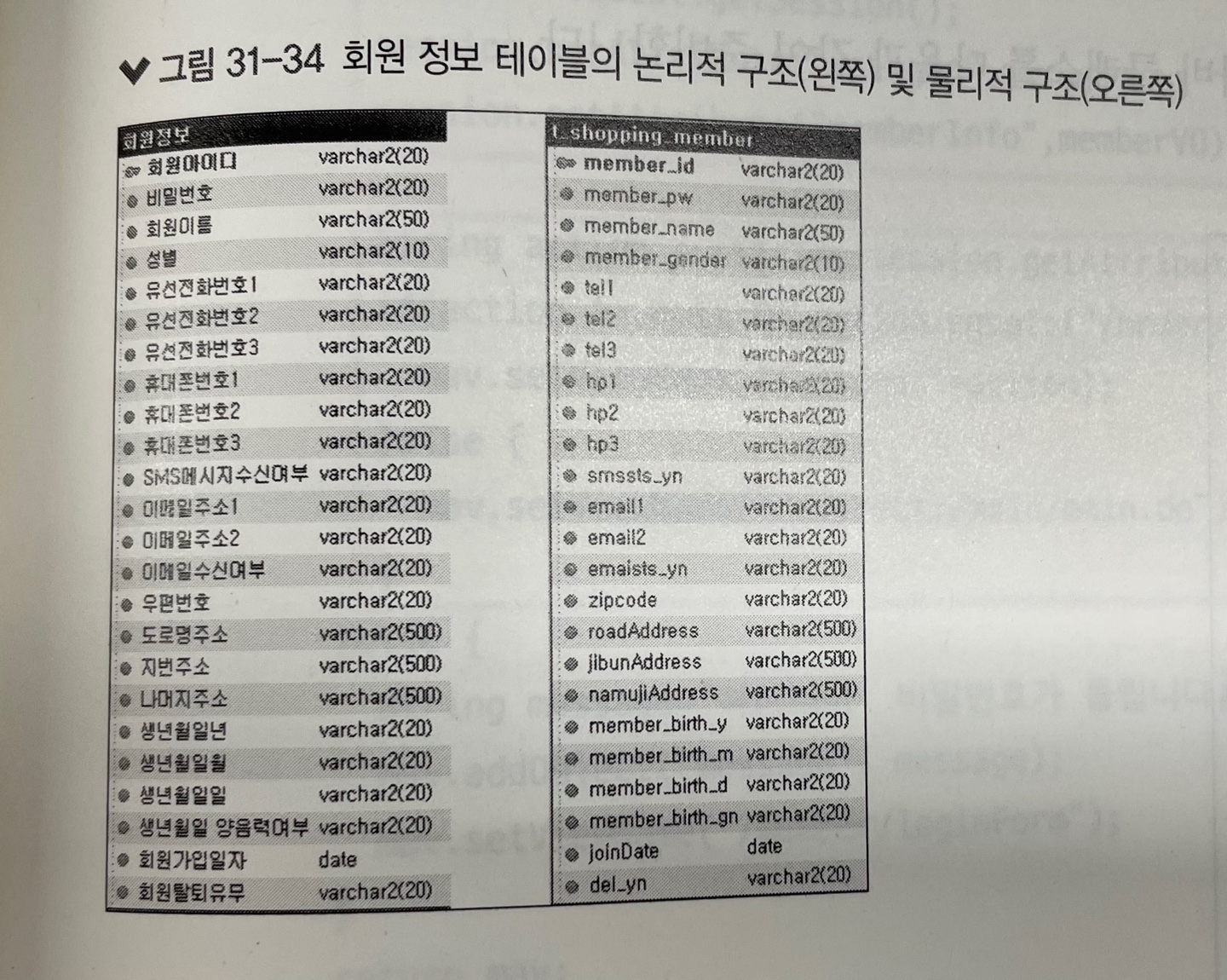 * 다음은 회원 가입 시 회원 정보가 저장되는 테이블의 논리적 구조와 물리적 구조이다.