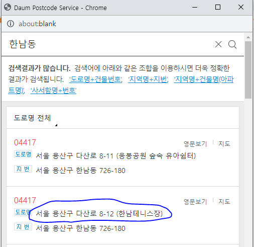 6. 조회된 주소 목록에서 해당되는 주소를 선택한다.
