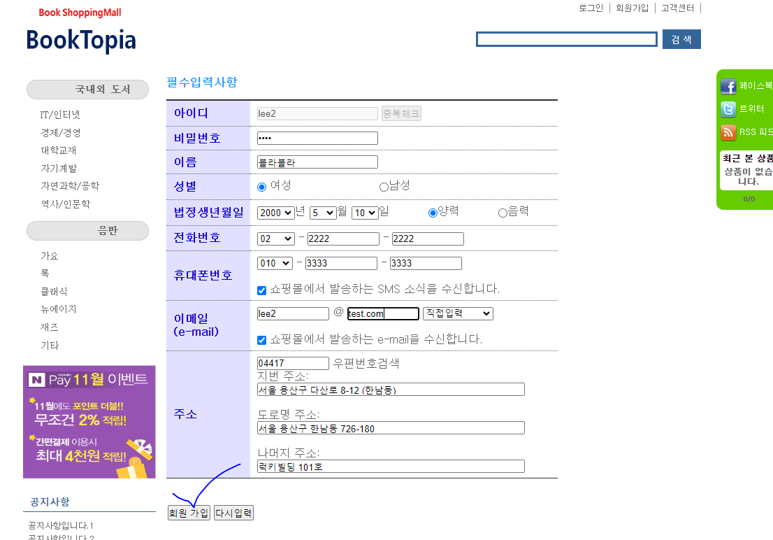 7. 나머지 주소를 입력한 후 회원가입을 클릭한다.