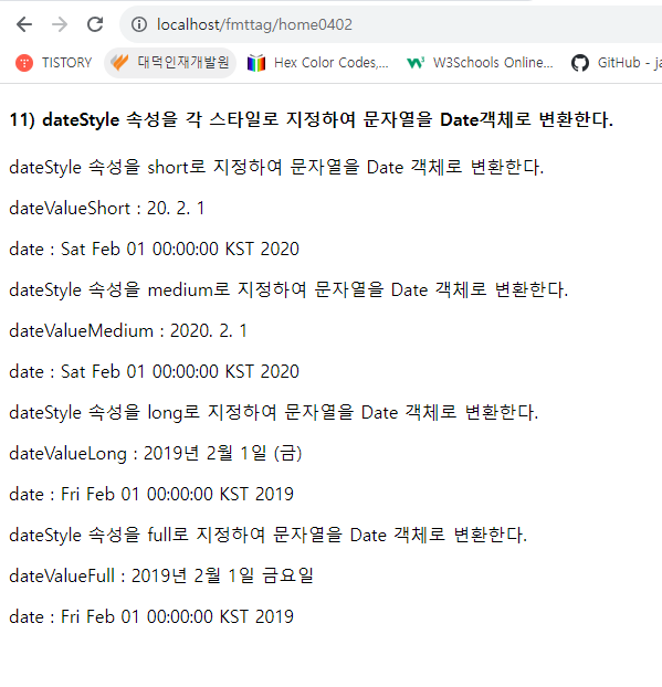 <h4>11) dateStyle 속성을 각 스타일로 지정하여 문자열을 Date객체로 변환한다.</h4>