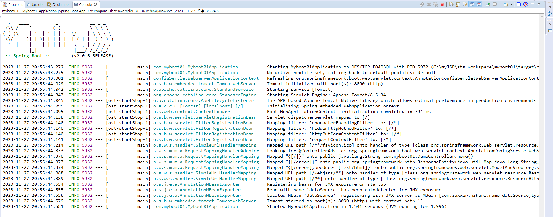 5. 스프링 부트 애플리케이션이 실행되면서 STS 콘솔창에 다음과 같은 로그가 출력된다.