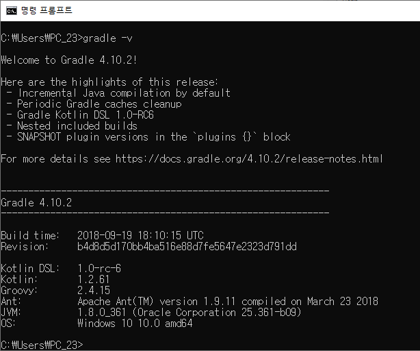 11. 정상적으로 동작하는지 명령 프롬프트를 열고 gradel -v 명령어를 입력한다. 다음과 같이 그레이들 버전이 나오면 성공이다!