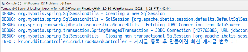 log.info("게시글 등록 후 만들어진 최신 게시글 번호 : " + board.getBoardNo());