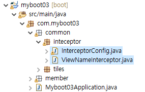 * 이전에 구현했던 회원 기능에 이어서 인터셉터를 구현해 보자. 브라우저의 요청명을 인터셉터가 처리한 후 타일즈로 보낼 뷰이름을 가져오는 실습이다.
