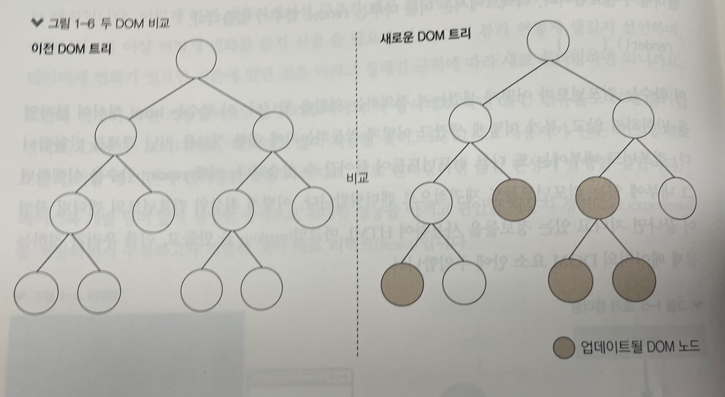 * 자바스크립트를 사용하여 두 가지 뷰를 최소한의 연산으로 비교한 후, 둘의 차이를 알아내 최소한의 연산으로 DOM 트리를 업데이트 하는 것이다.
