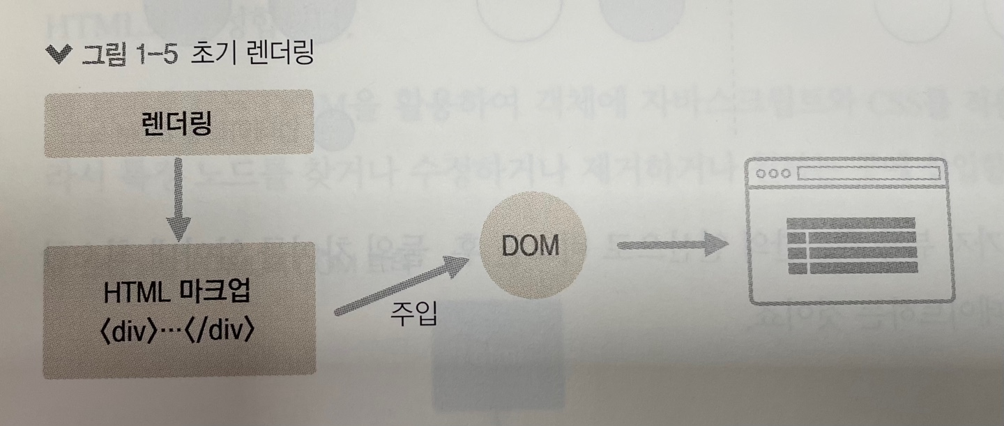 * 컴포넌트를 실제 페이지에 렌더링할 때는 분리된 두 가지 절차를 따르는데, 먼저 문자열 형태의 HTML 코드를 생성한 후 특정 DOM에 해당 내용을 주입하면 이벤트가 적용된다.