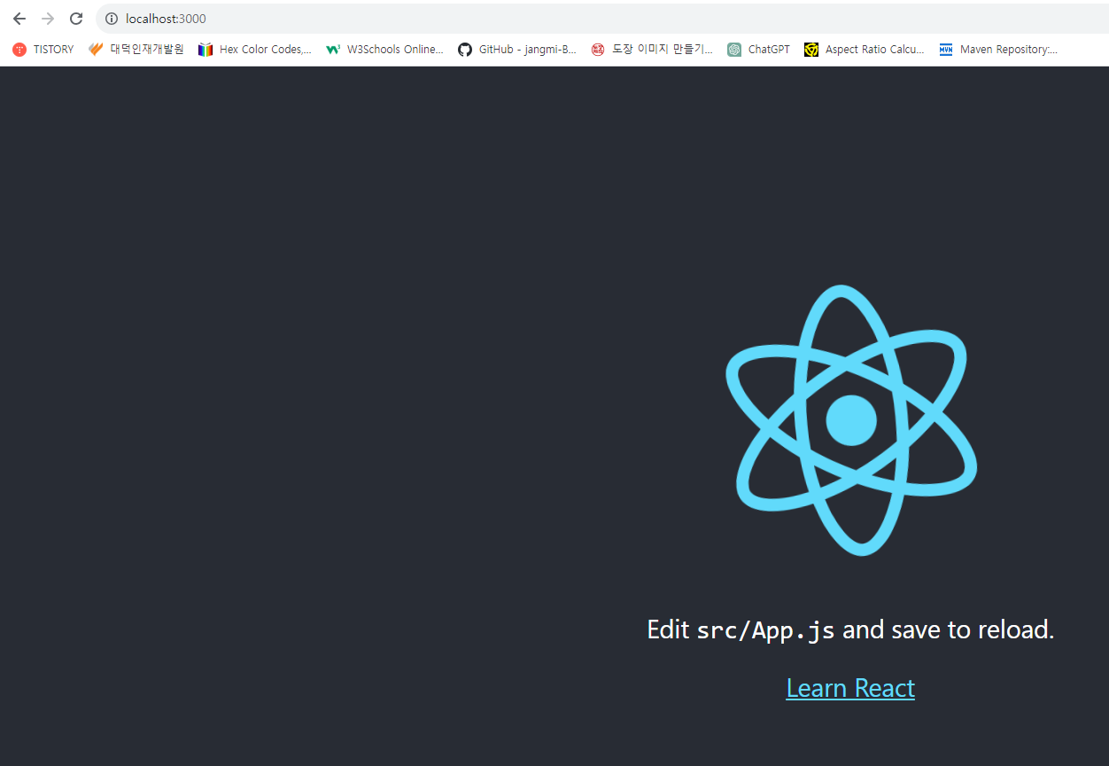 * 그리고 브라우저에서 자동으로 리액트 페이지가 띄워질 것이다. 만약 페이지가 자동으로 열리지 않았다면 브라우저 주소창에 다음 링크를 직접 입력하여 열어 보자.