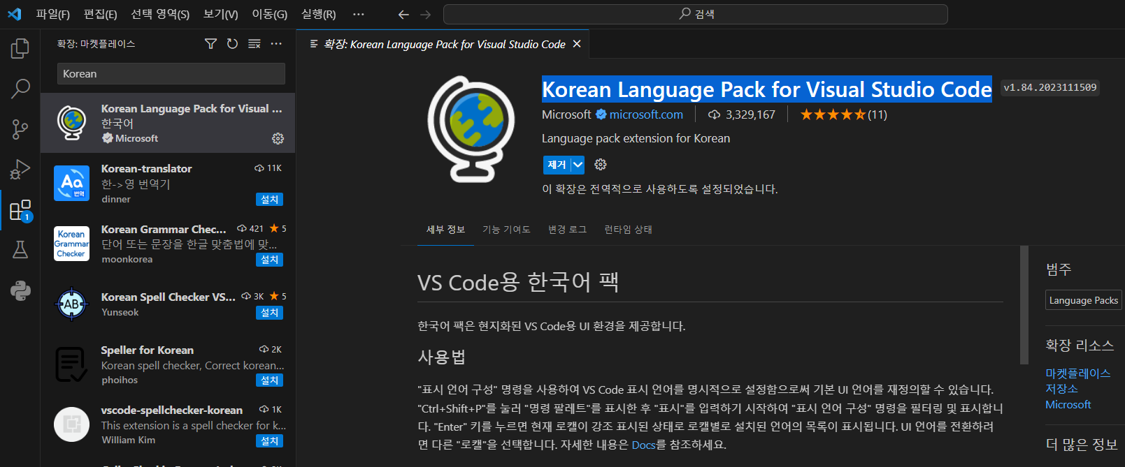 * 먼저 VS Code 확장 마켓플레이스에서 Korean Language Pack for Visual Studio Code를 설치한다.
