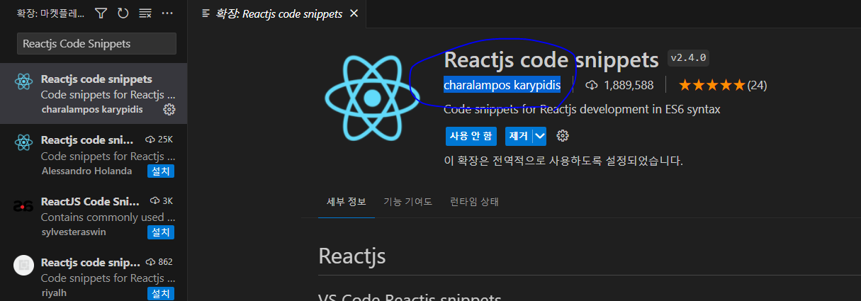 2. Reactjs Code Snippets : 리액트 컴포넌트 및 라이프사이클 함수를 작성할 때 단축 단어를 사용하여 간편하게 코드를 자동으로 생성해 낼 수 있는 코드 스니펫 모음이다. 검색했을 때 유사한 결과가 여러 개 나올 수 있는데 제작자가 charalampos karypidis 인 것을 설치하자.