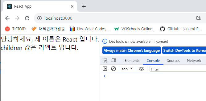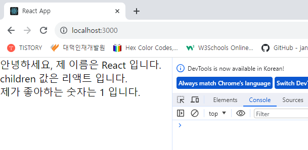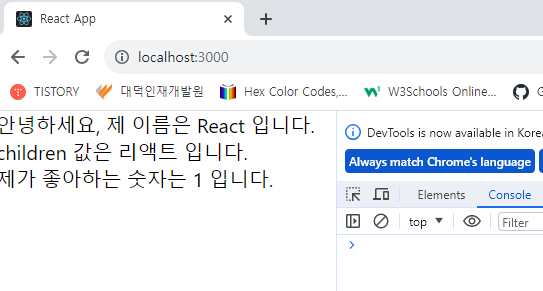 * 위 코드에서 MyComponent 태그 사이에 작성한 리액트라는 문자열을 MyComponent 내부에서 보여 주려면 props.children 값을 보여 주어야 한다.