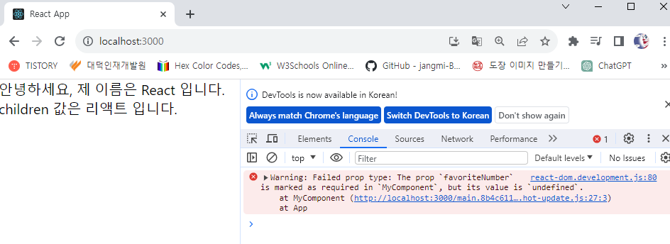 * propTypes 를 지정하지 않았을 때 경고 메시지를 띄워 주는 작업을 해 보자. propTypes 를 지정할 때 뒤에 isRequired 를 붙여 주면 된다. 이번에는 favoriteNumber 라는 숫자를 필수 props로 지정해 보자.