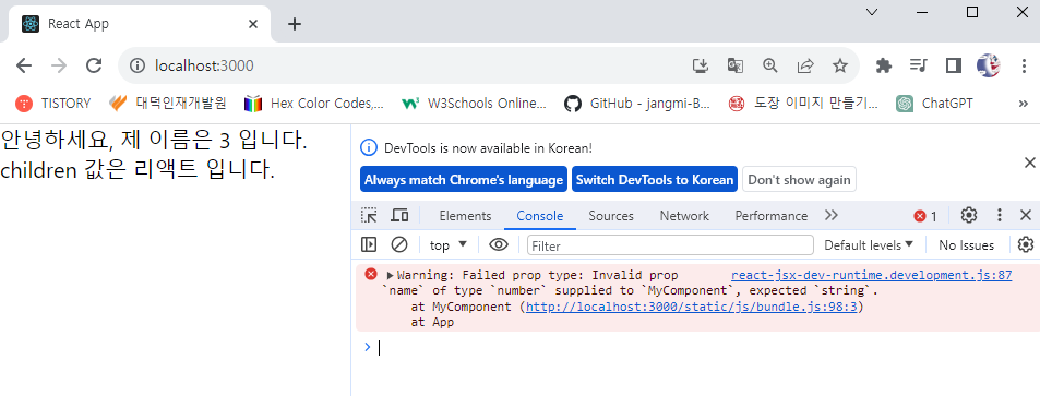 * 만약 컴포넌트에 설정한 props가 propTypes에서 지정한 형태와 일치하지 않는다면 브라우저 개발자 도구의 Console 탭에 다음과 같은 결과가 나타난다.