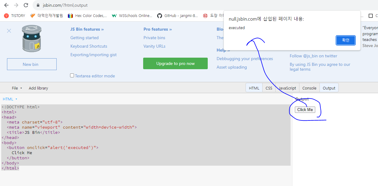 * 다음 코드를 HTML 파일로 저장하여(프로젝트 디렉터리 외부에 저장하자) 웹 브라우저로 열어보거나, JSBin에서 코드를 입력하여 테스트해 보자. 여기서는 JSBin을 사용해 보자.
