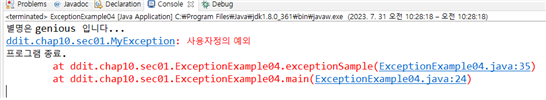 throw new MyException("사용자정의 예외"); // at ddit.chap10.sec01.ExceptionExample04.exceptionSample(ExceptionExample04.java:29)