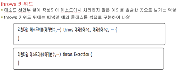 // throws 뒤에 2개의 예외 클래스(NullPointerException, Exception)를 선언하여 메서드를 부르는 쪽에서 예외 처리를 하도록 미룬다. 수익자 부담 원칙.