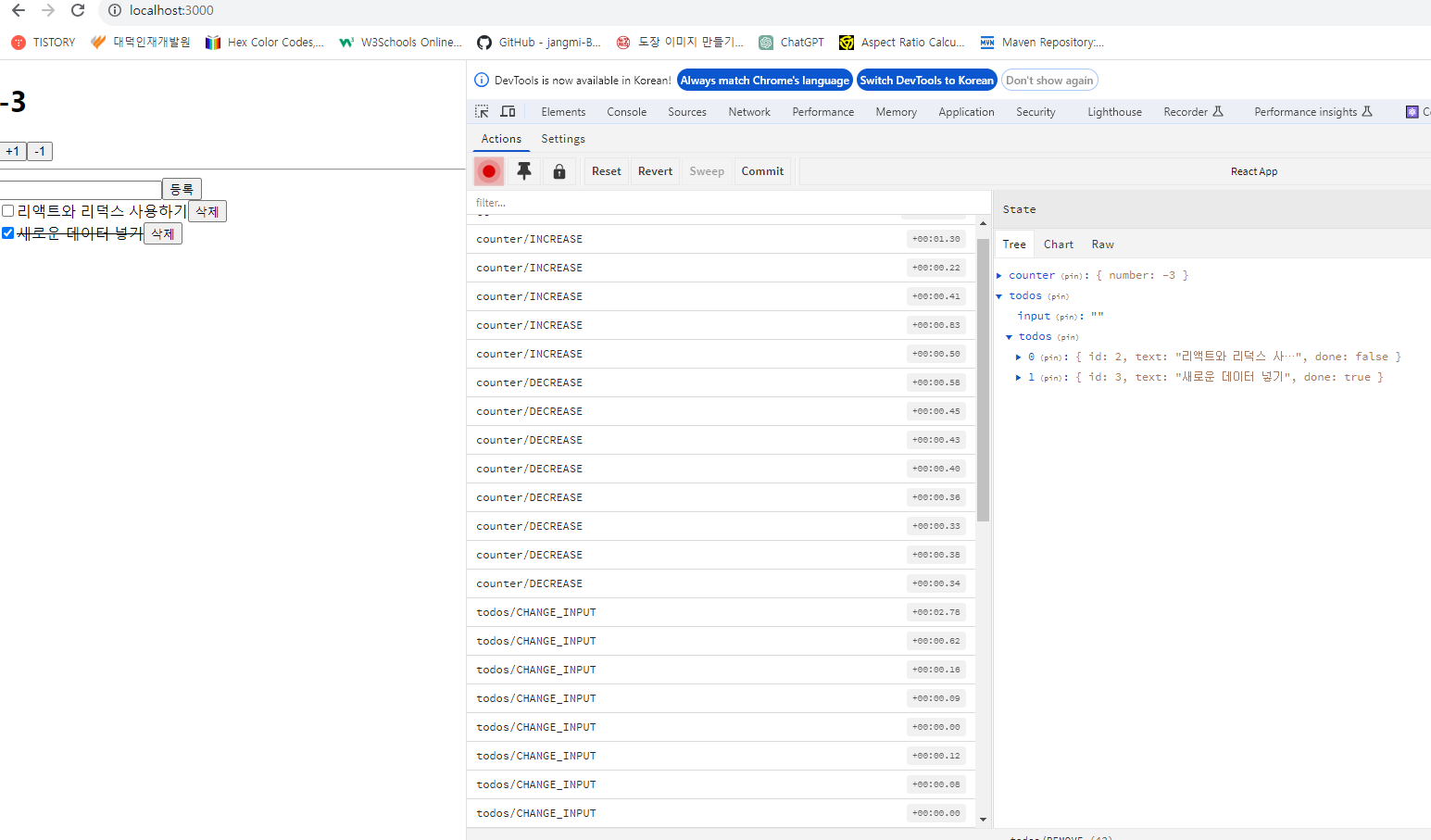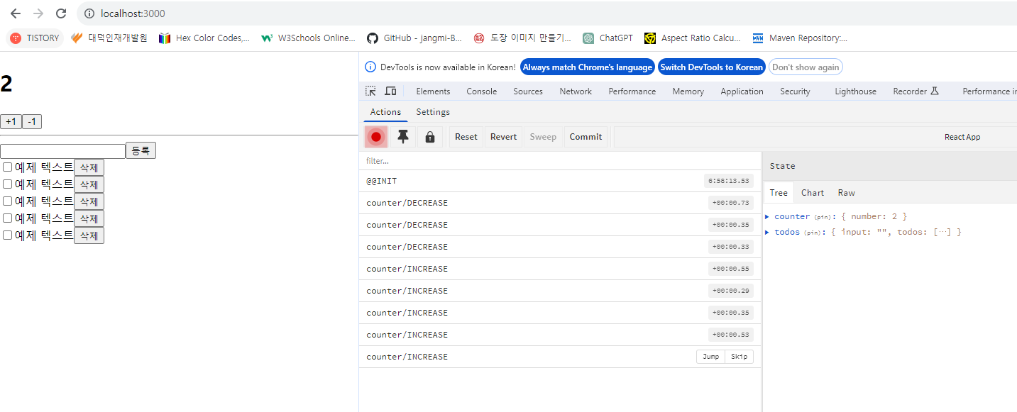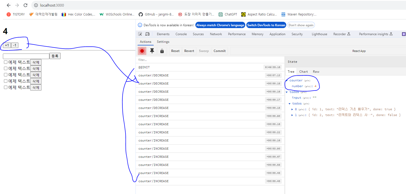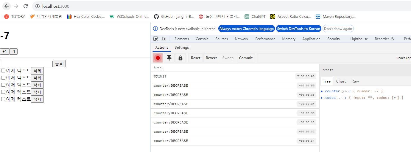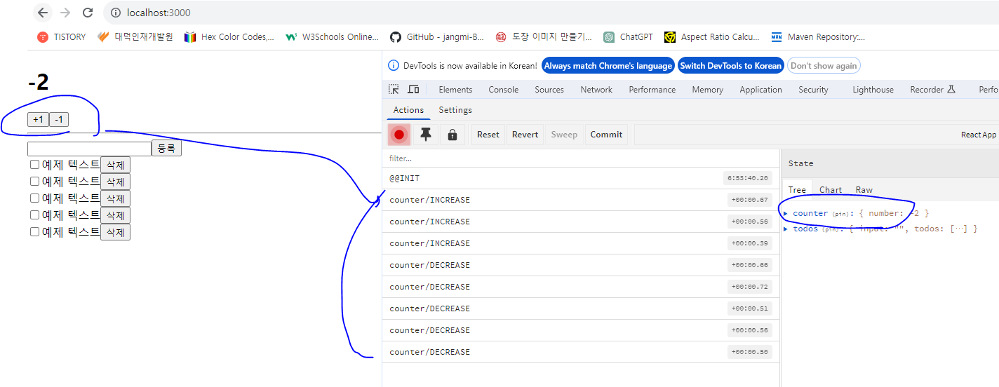 * 이제 다시 +1, -1 버튼을 눌러 보자. 숫자가 바뀌는가? 리덕스 개발자 도구도 한번 확인해 보자.