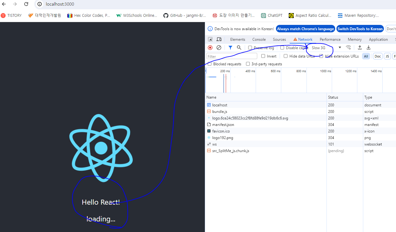 위 메뉴에서 Slow 3G를 선택하면 느린 네트워크 속도를 시뮬레이트 할 수 있다. 설정 후 Hello React!를 클릭해 보자. 로딩 문구가 나타나는가?