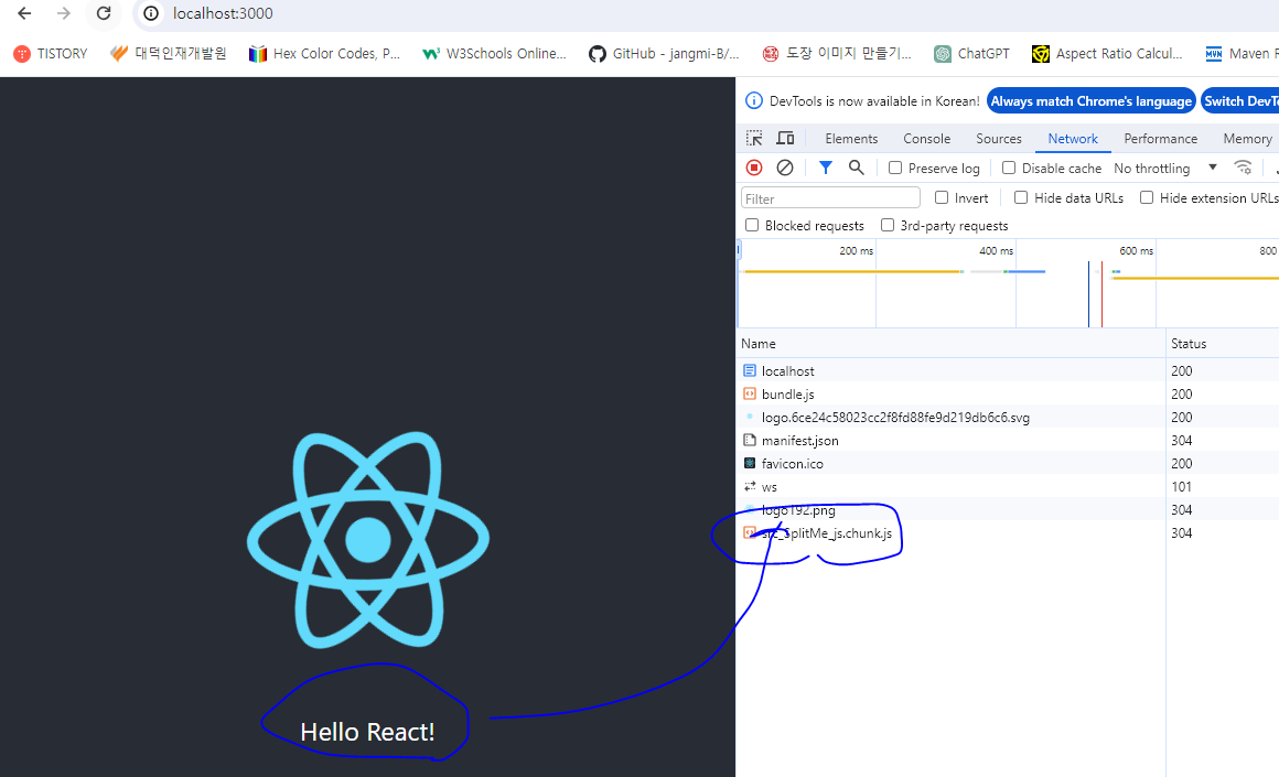 * 브라우저를 열고 개발자 도구의 Network 탭을 연 다음, Hello React!를 클릭해 보자.