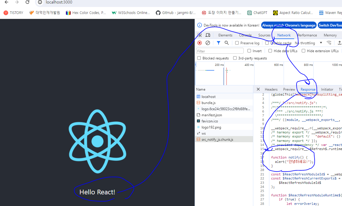 * Hello React!를 클릭하는 시점에 새로운 자바스크립트 파일을 불러올 것이다. 불러온 파일의 내용을 확인해 보면 notify에 관련된 코드만 들어 있다.