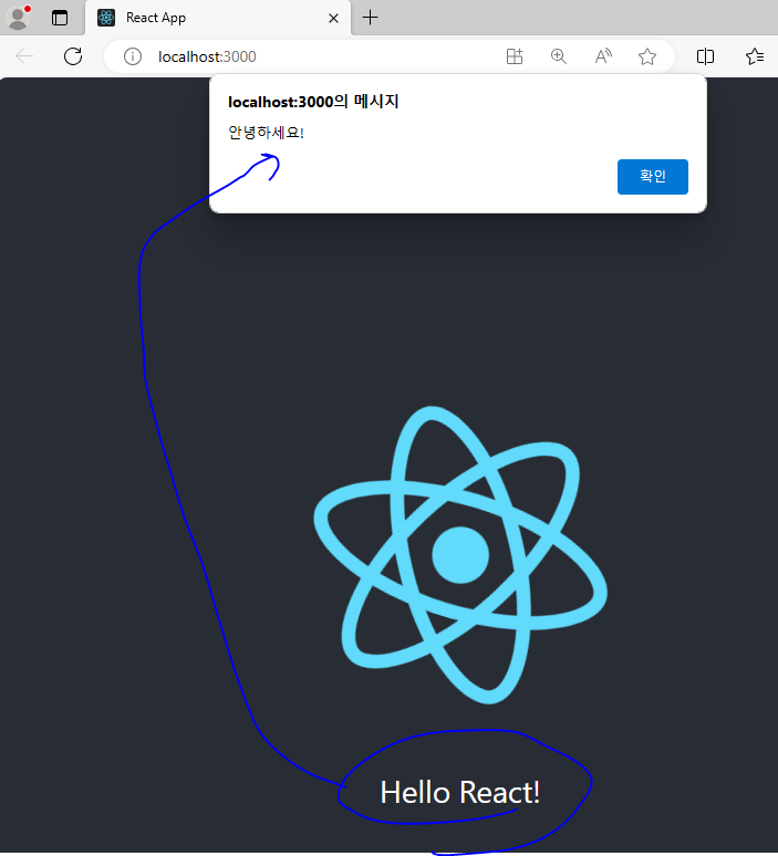 * Hello React! 문구를 누르면 notify 함수가 실행되도록 App 컴포넌트를 수정한다.