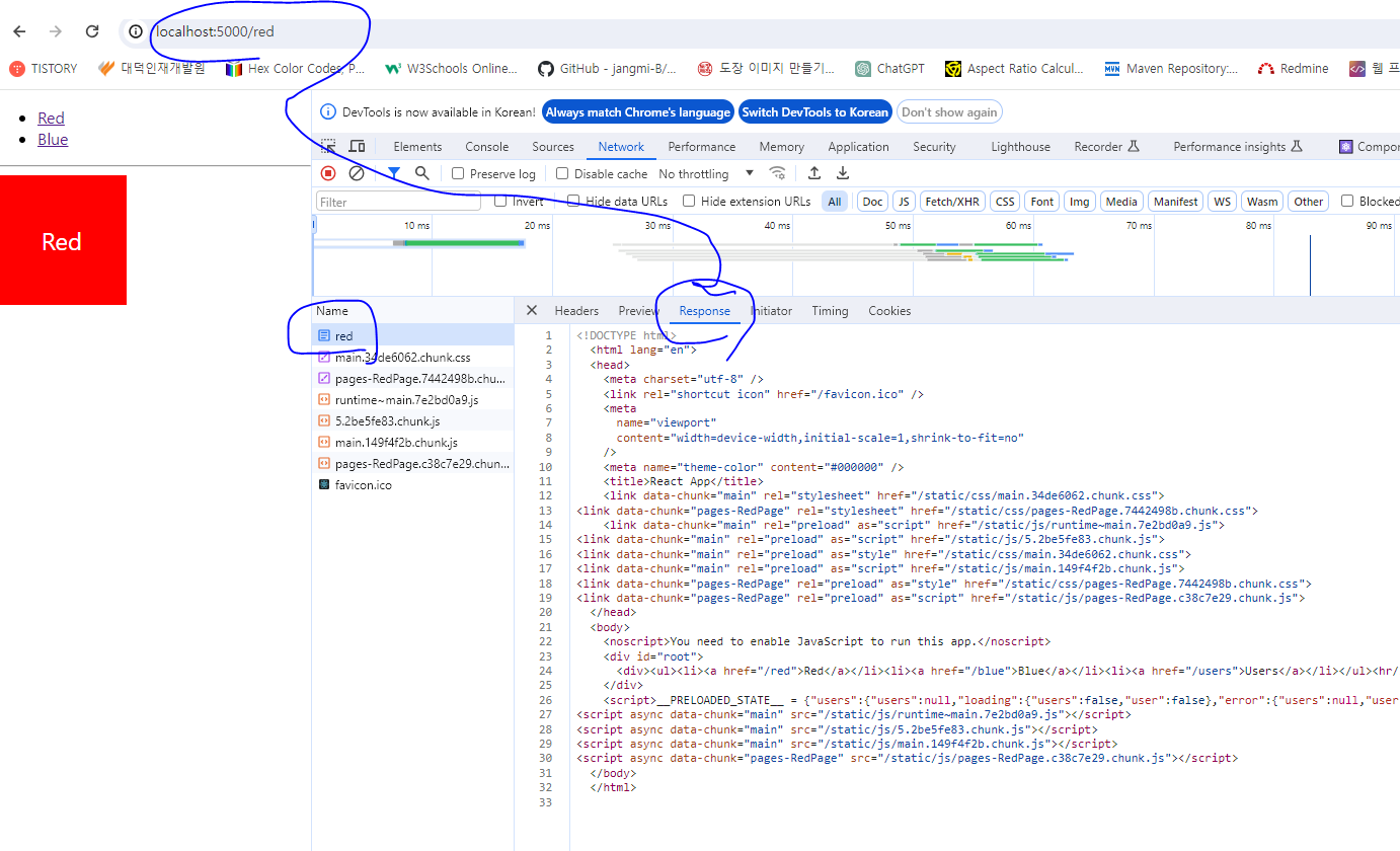- http://localhost:5000/red 페이지에 들어가 CSS도 함께 적용되는지 확인하고, 개발자 도구의 Network 탭에서 서버 사이드 렌더링이 되었는지 검증해 보자. 여기서 링크를 눌러 이동할 때는 클라이언트 렌더링이 되어야 한다. 즉, 다른 링크를 클릭하여 다른 페이지로 이동할 때 네트워크 요청이 추가로 발생하지 않아야 한다.