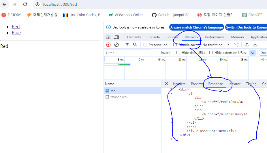 * 새로 고침을 하고 나서 맨 위에 있는 항목(위 그림에서는 Red)을 누른 후 우측의 Response를 눌러 보자. 컴포넌트 렌더링 결과가 문자열로 잘 전달되고 있는가?