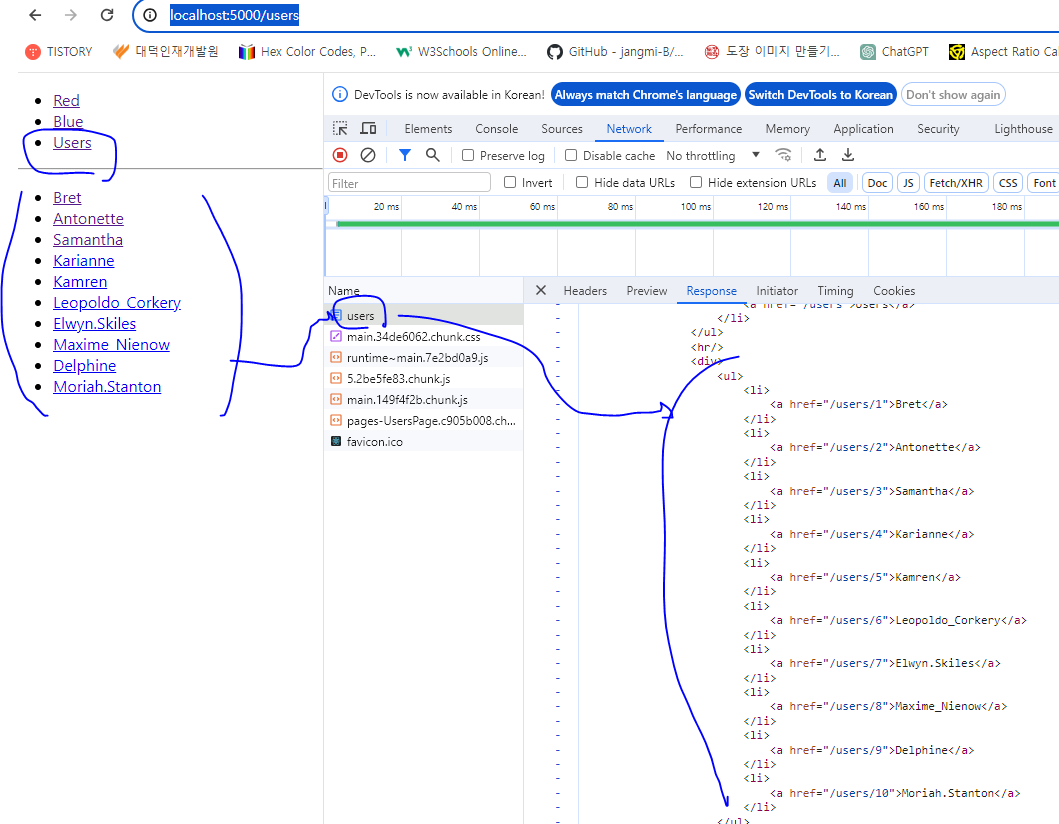 * 결과물이 잘 나타났는가? 개발자 도구를 열고 Network 탭의 Response 부분에서도 잘 나타났는지 확인해 보자.