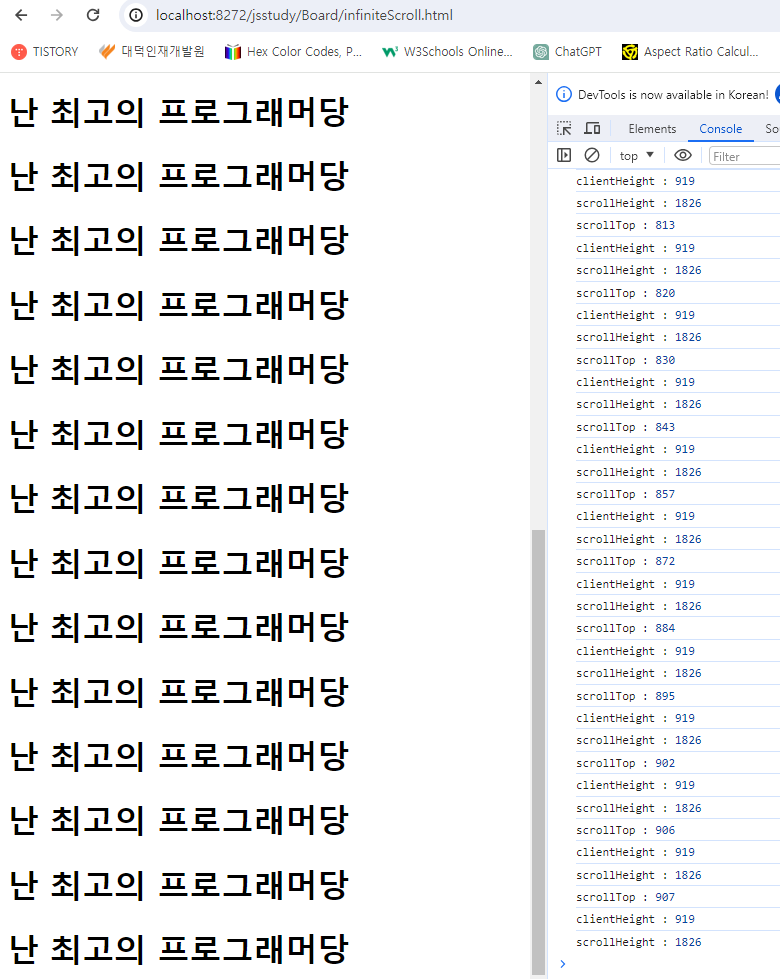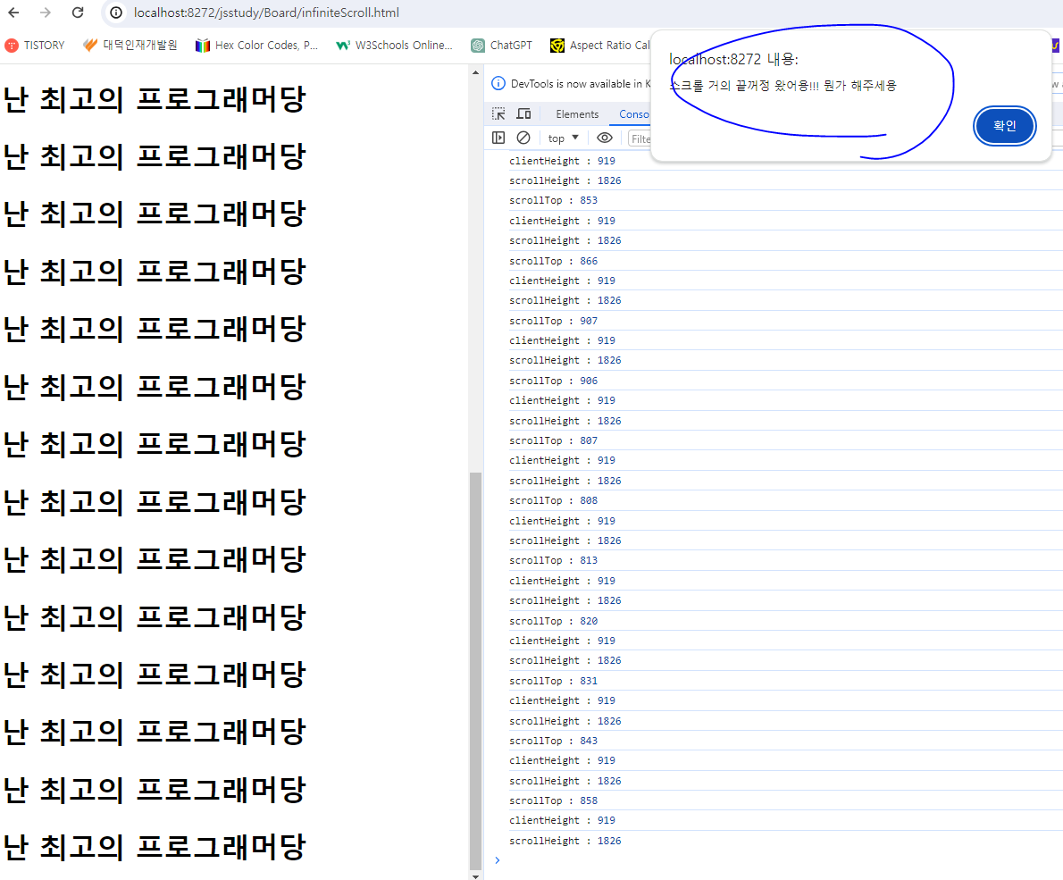 alert("스크롤 거의 끝꺼정 왔어용!!! 뭔가 해주세용");