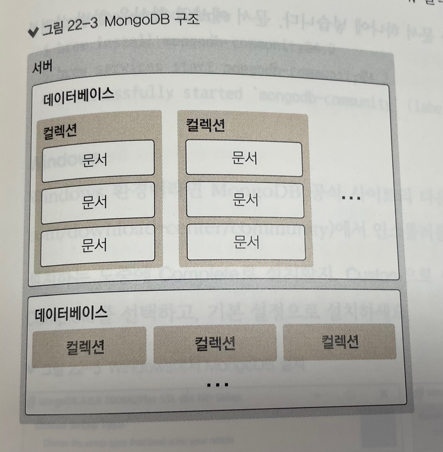 * MongoDB 구조는 다음과 같다. 서버 하나에 데이터베이스를 여러 개 가지고 있을 수 있다. 각 데이터베이스에는 여러 개의 컬렉션이 있으며, 컬렉션 내부에는 문서들이 들어 있다.