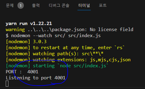 * .env 파일에서 PORT를 4001로 변경한 뒤 서버를 한번 재시작해 보자. .env 파일을 변경할 때는 nodemon에서 자동으로 재시작하지 않으므로 직접 재시작해야 한다.