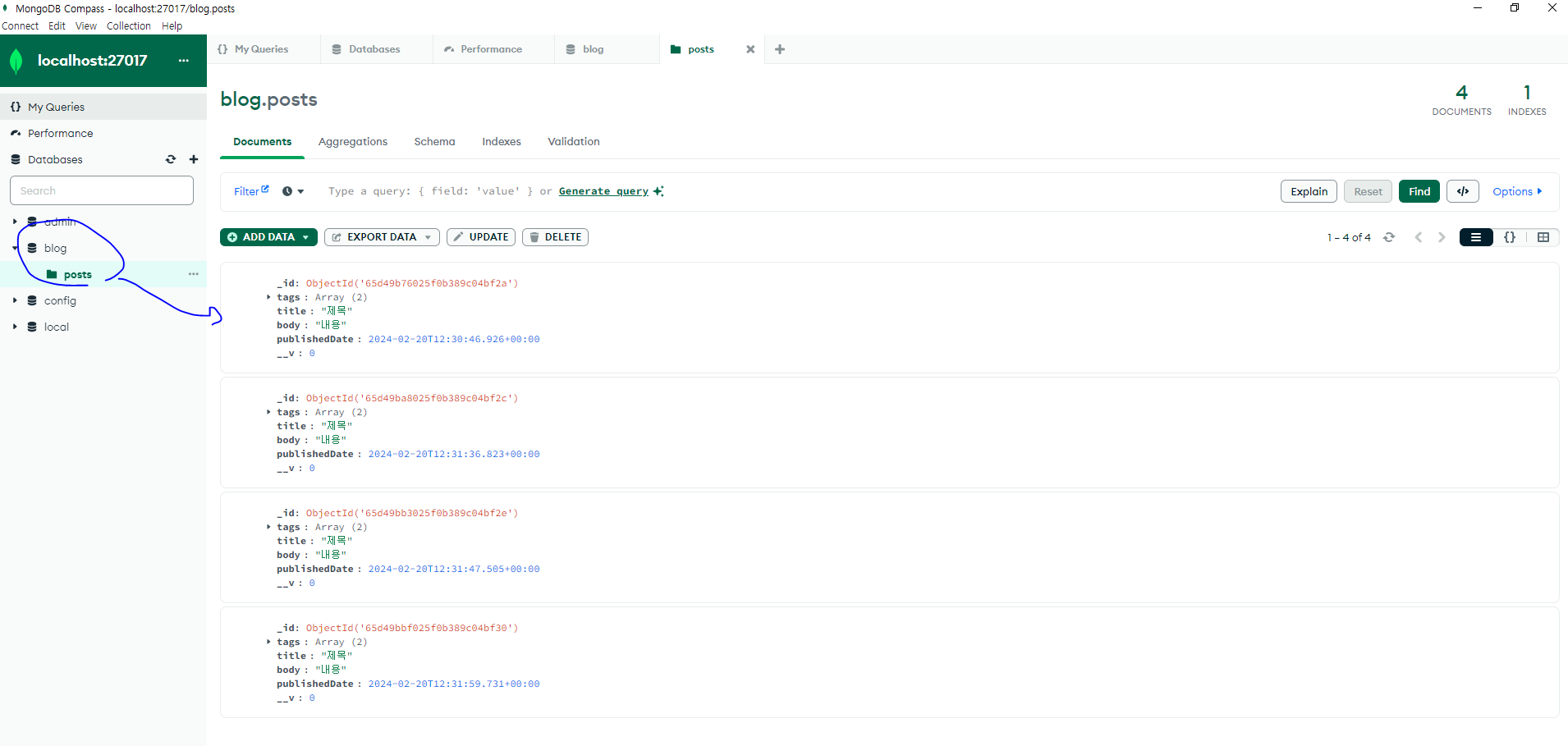* 다음으로 MongoDB Compass에서 좌측 상단의 새로고침 버튼을 누르면 blog 데이터베이스가 나타날 것이다. blog 데이터베이스를 선택한 뒤 posts 컬렉션을 열어 보자.